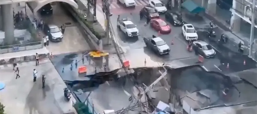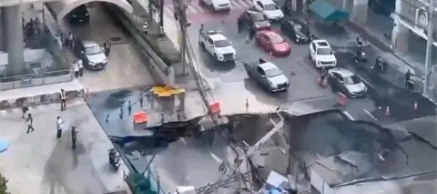 Se abre socavón de 50 metros de profundidad en Bangkok; afecta vehículos, postes y edificios